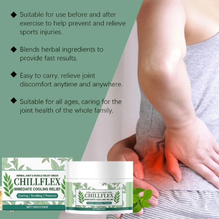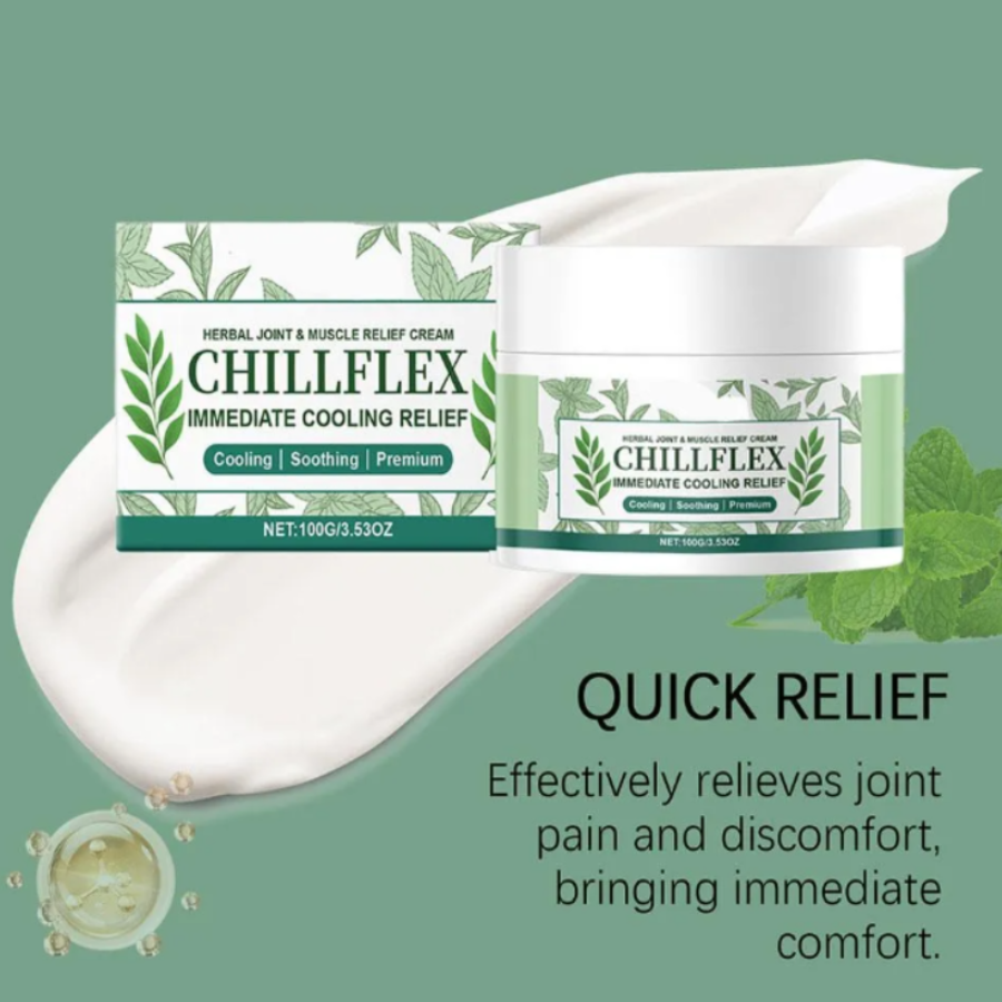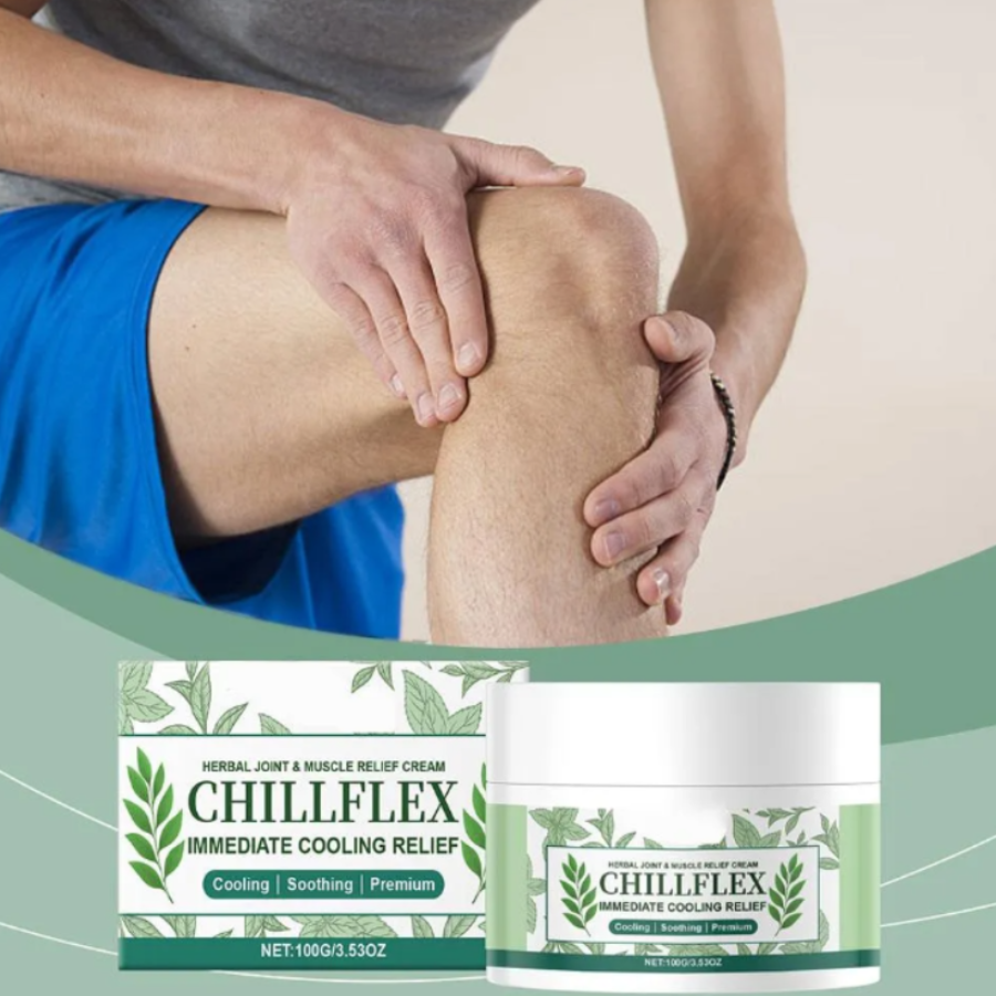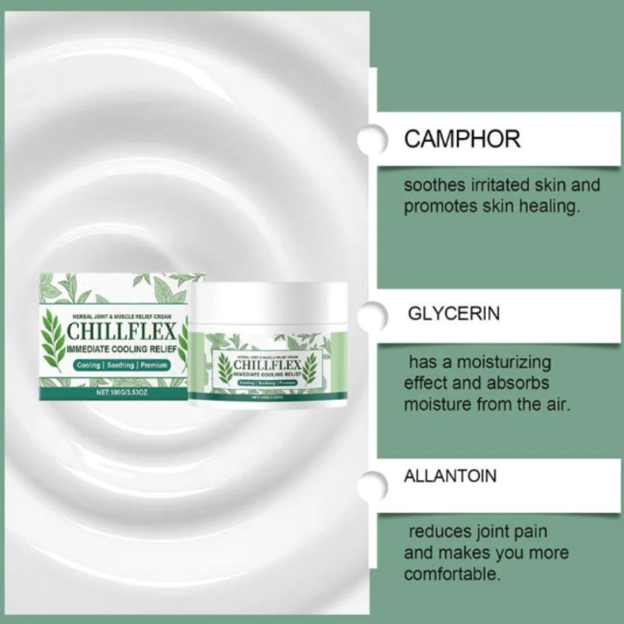 CHILLFLEX es un gel calmante y refrescante diseñado para aliviar músculos y articulaciones en todo el cuerpo. Con extractos naturales de árnica, menta y manteca de karité, esta pomada ligera y no grasa se absorbe rápidamente sin dejar residuos pegajosos.